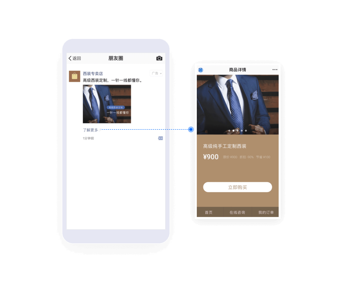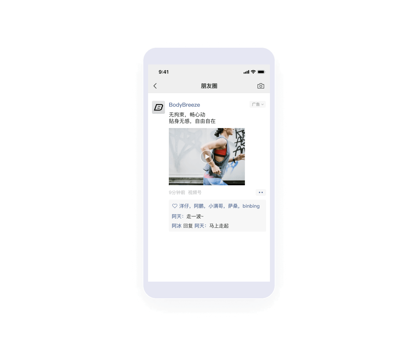 推廣視頻號動(dòng)態(tài)到微信廣告流量場(chǎng)景,在朋友圈以原生形式呈現,在公眾號小程序與場(chǎng)景相結合,可上滑展示廣告主更多視頻