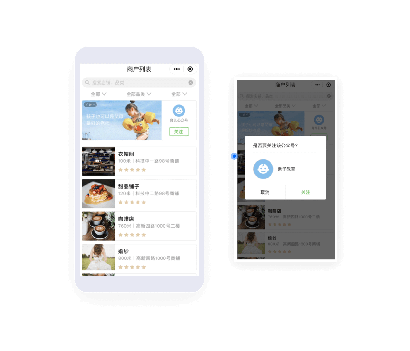 借助LBS技術(shù),可以將您門(mén)店的地址,介紹,活動(dòng)等信息精確推廣至門(mén)店周邊0.5-5公里范圍內的人群,增強所在地區人群對您商戶(hù)品牌的認知,吸引周邊用戶(hù)到店消費。